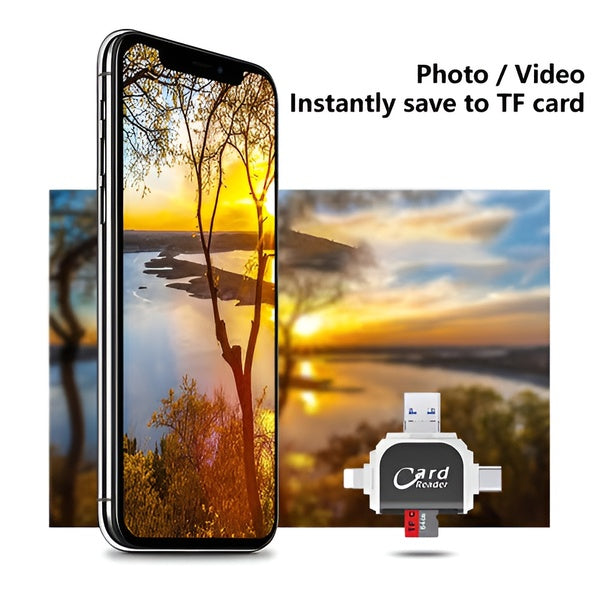 Übertragen Sie Ihre Dateien blitzschnell mit dem universellen 4-in-1 Kartenleser! Ob SD- oder TF-Karten – dieses multifunktionale Gerät unterstützt USB, Type-C, Micro-USB und Lightning-Anschlüsse, sodass Sie es mit nahezu allen Geräten nutzen können. Ideal für Smartphones, Tablets, Laptops und PCs – für eine mühelose, schnelle und sichere Datenübertragung!